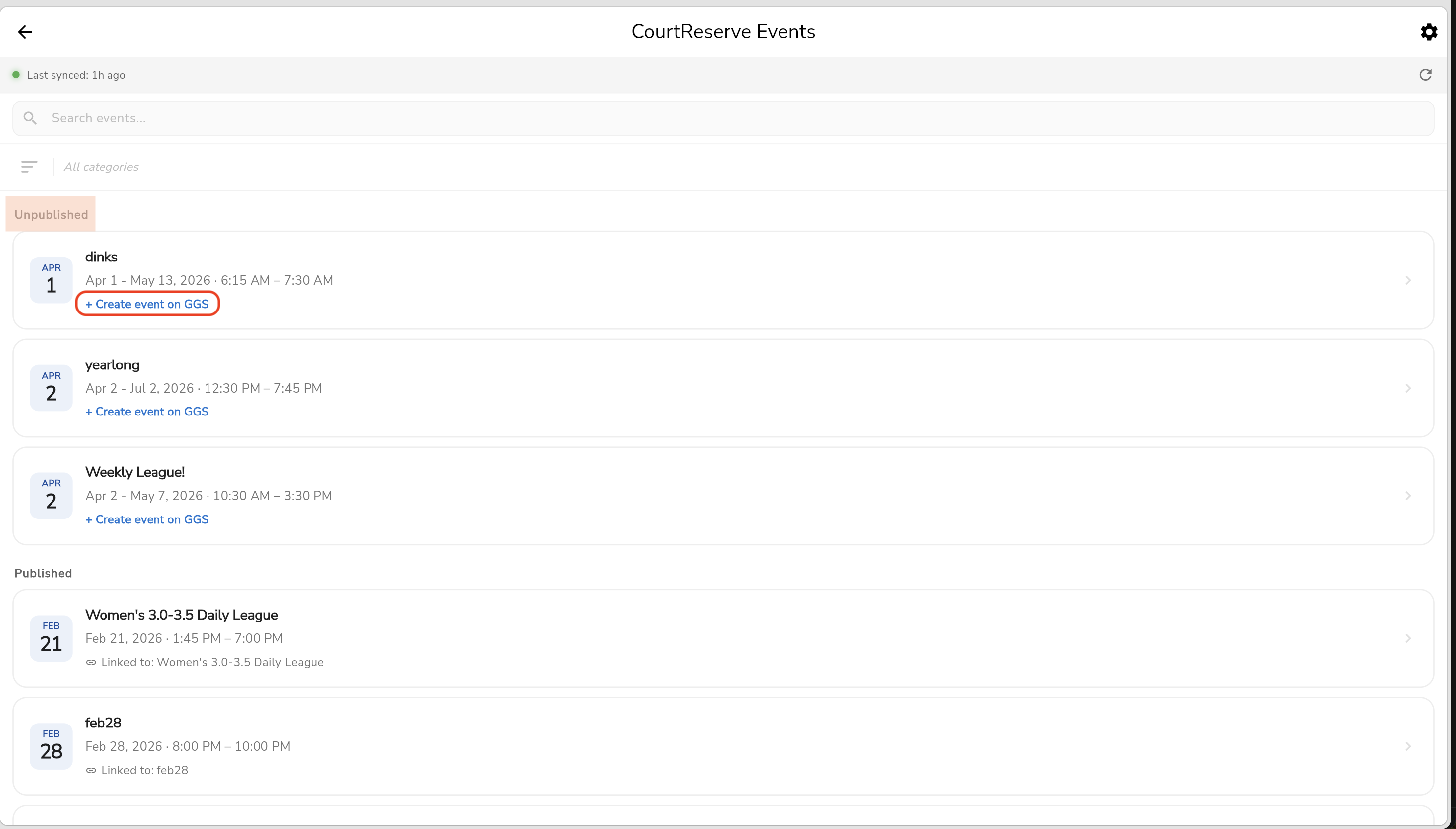 Choose an event under Unpublished and press "+ Create Event on GGS"