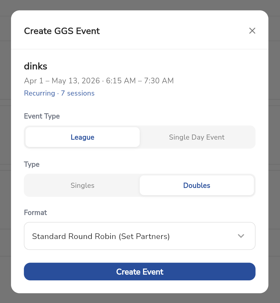 Create your event from a CourtReserve event if you want registrations to stay linked and synced in Good Game Sports. This is the required path for CourtReserve-based event syncing.