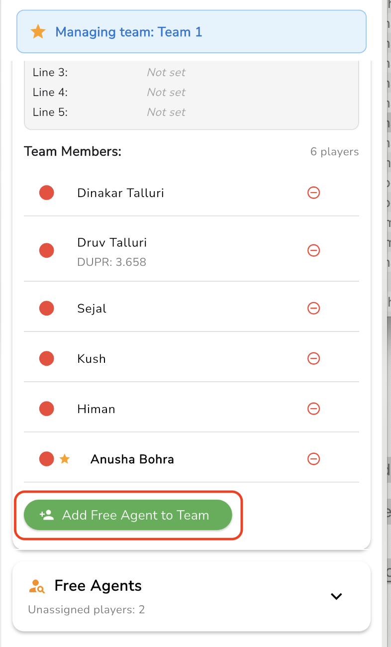 Available free agents appear as players register for the event. If no players are listed, there may not be any open free agents yet.